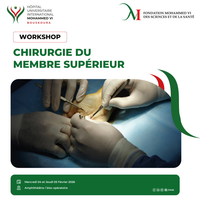 L’Hôpital Universitaire International Mohammed VI Bouskoura organise un workshop scientifique consacré à la chirurgie du membre supérieur, conçu comme un temps de pratique et de discussion clinique autour des techniques opératoires.